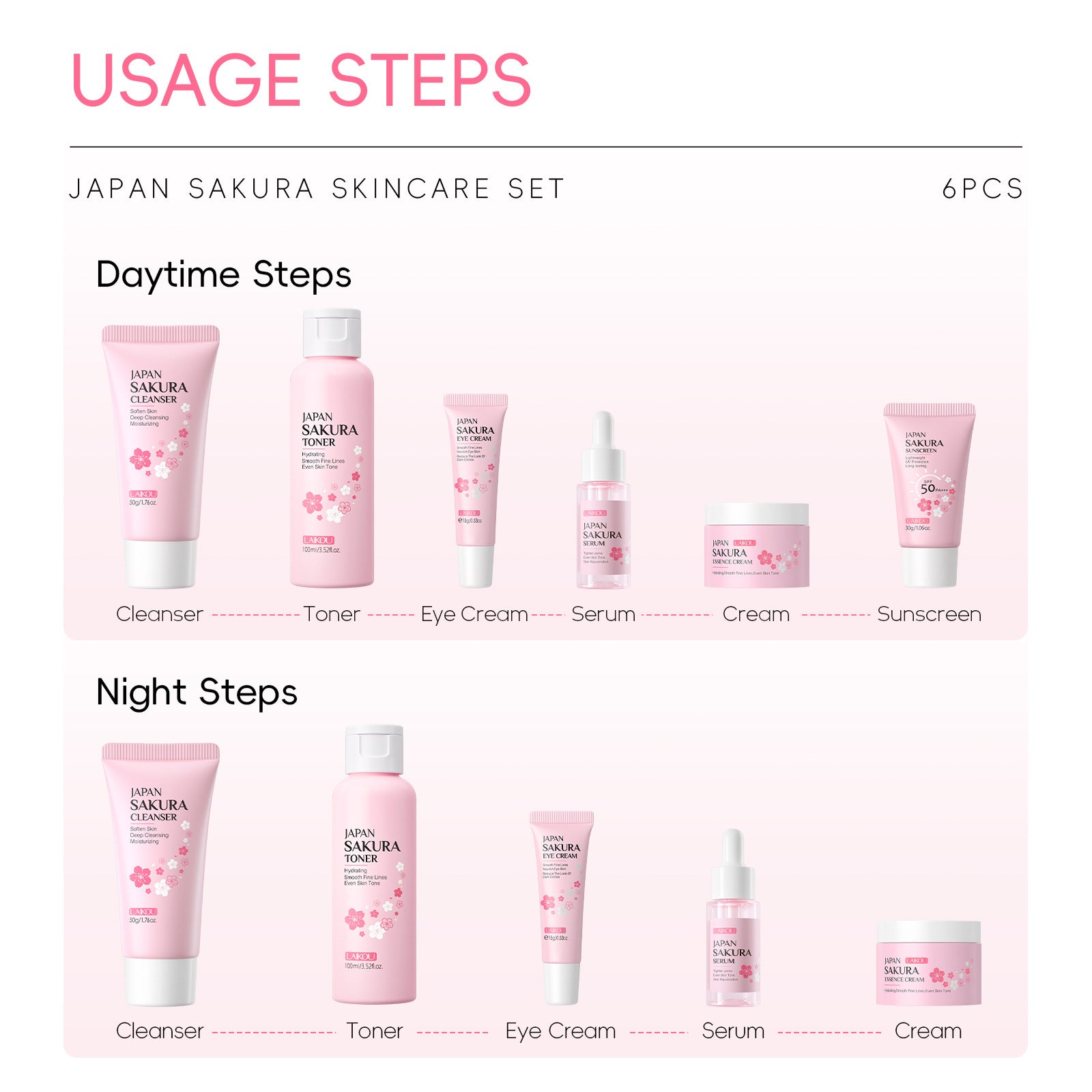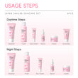 Japan Sakura Skincare Set – A complete 6-step skincare routine enriched with Sakura (cherry blossom) extracts to cleanse, hydrate, brighten, and protect your skin, leaving it soft, radiant, and refreshed.
